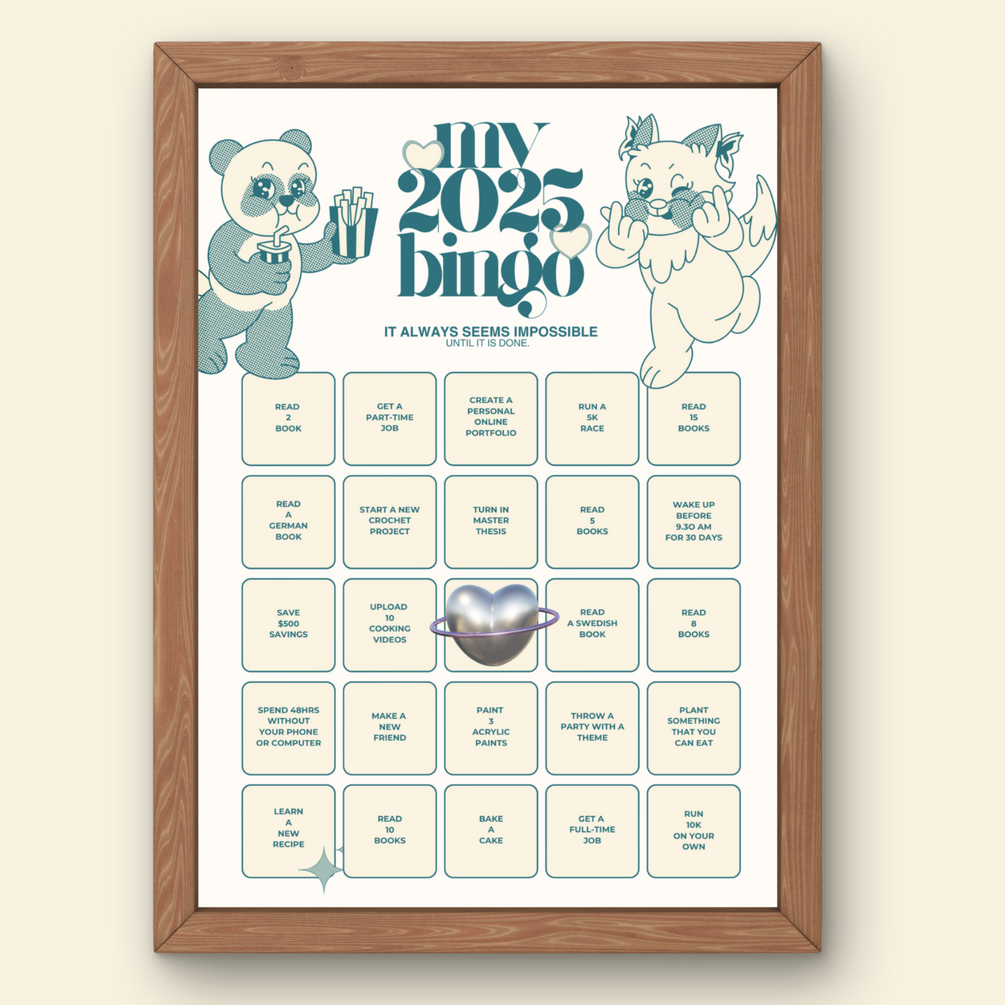 Start the New Year with fun, inspiration, and creativity! This A4-sized 2025 Bingo Card Template is the perfect way to manifest your dreams, track goals, or enjoy a fun activity with friends and family. Whether it's for a girls’ night, a vision board party, or your personal journey, this bingo card is versatile, stylish, and ready to bring your 2025 plans to life.